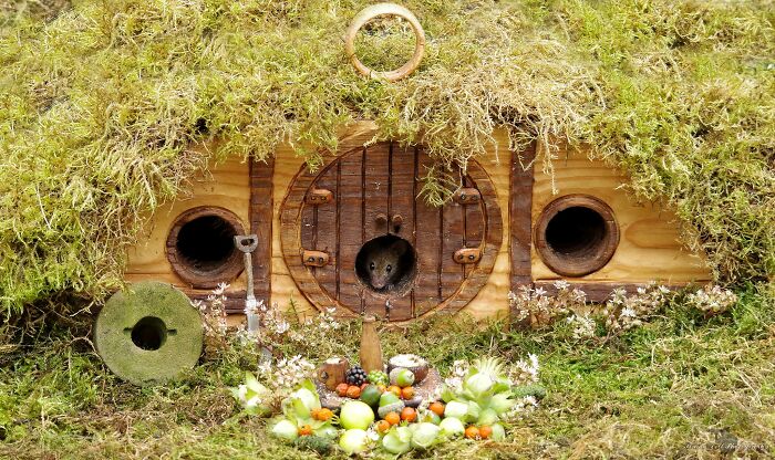 Being a wildlife photographer and after discovering a family of mice by the brambles in my garden, I set about creating a little world and place for the mice to live, building them tiny homes in the style of hobbit houses, all equipped with everything a tiny home should have, such as tables, chairs, and even little small plates, bowls, and mugs, all crafted by hand from wood scraps. The mice soon moved into the little homes and started interacting with the tiny props I would make them. All this started back in 2018, and since then, we have had many generations of mice and seen lots of babies grow from tiny mice to adults and soon become parents or even grandparents. Collecting fruits, nuts, and berries from the local trees, the mice get a large selection of food to nibble on daily along with some peanuts and seed as a treat; we even mix a little peanut butter with water to fill the tiny mugs, often calling it peanut butter beer. What started as one mouse home soon became a whole mouse village as I built and crafted to ensure every mouse had a house or place to hide and keep safe or shelter from the rain. By night I place over a wire net cover to keep the little guys safe and by day spend many hours just watching the little guys running around or investigating the little things I made them. Here are just some of the many thousands of images I have captured of the mice over the years. I hope you enjoy my little mouse world and be sure to pop over to our Facebook pages to see more. "The mouse by the brambles " and "George the mouse in a log pile house."
