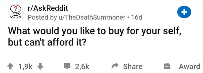 A few weeks ago, Redditor u/TheDeathSummoner posted a question: "What would you like to buy for yourself, but can't afford it?" Other users immediately started replying, listing all the things they wish they could invest in.