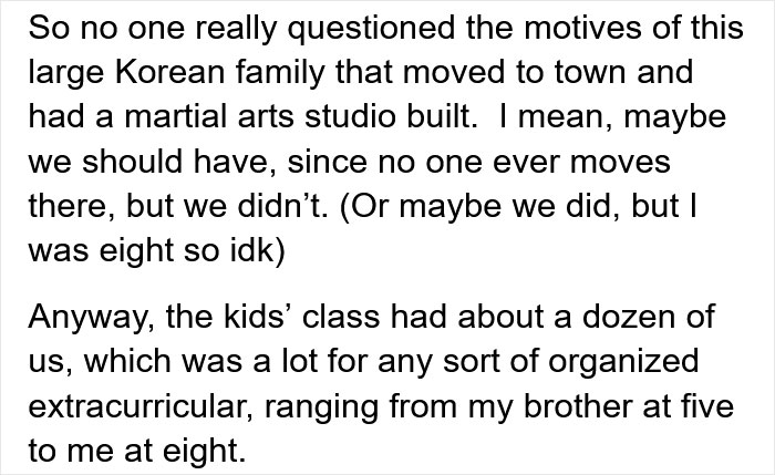 A couple of stories later, probably-voldemort entered the chat and changed the whole restaurant dynamic with a pretty detailed story of a crime front in a hapkido martial arts studio in a small and quaint Canadian town that was run by an older Korean gentleman who’d often get visitors, friends from Korea who’d also do a little cameo and teach in the studio.