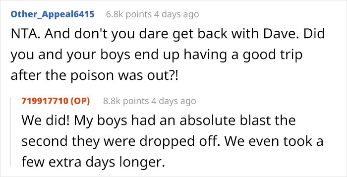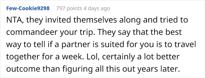 It’s bad enough that the boyfriend and his daughter joined the redditor’s long-planned vacation without being asked to. It’s bad enough that they were miserable company. But the worst part? The author of the post wasn’t able to do anything with her kids. You know, despite the entire trip being about them and what they wanted.
