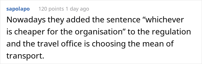 It is interesting that such cases were not isolated as the commenters cited at least three similar situations that happened to themselves or to acquaintances, and in various countries. And the most remarkable thing is that the OP added that since then, a special provision for “choosing an option that is cheaper for the organization” has appeared in the rules of their company.