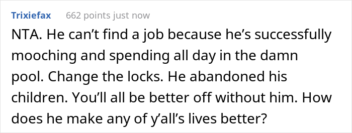 Well, the next day, OP’s daughter called her, crying. She explained that dad brought his friends over and, surprise, surprise, was doing that thing he’d been doing all the time. You know—being the pool mooch.