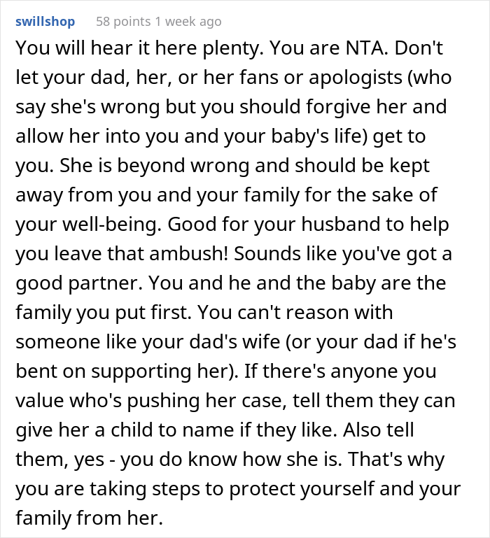 After the mom-to-be refused to bow down to her stepparent’s will, the woman went nuclear in the drama department. She showed her toxicity by trying to bring the pregnant woman down with her words. In short, the older woman tried to guilt her stepdaughter into giving in to her demands to name the baby.