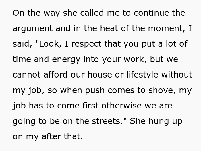 A quarrel broke out, but the husband could not stand it and just left the house and went to his office. Meanwhile, his wife called him and started arguing again. In the heat of the moment, the OP blurted out something like, “It’s only because of my job that we can afford our home and lifestyle. So my job must always take precedence over yours, otherwise we’ll just end up on the street!” After that, the wife hung up.