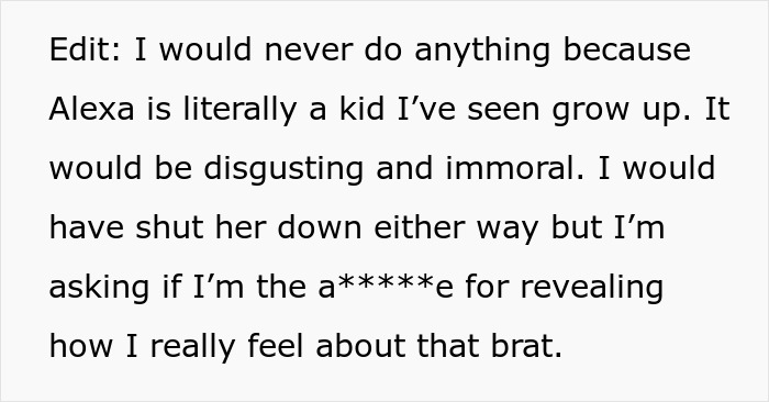 Such a rejection would hurt anyone’s feelings and Alexa ran out crying. OP’s wife thought that he was right for being honest, but he didn’t have to be so harsh with her. The man wonders if he didn’t have the right to tell Alexa how he saw her as now she is an adult and can take it.