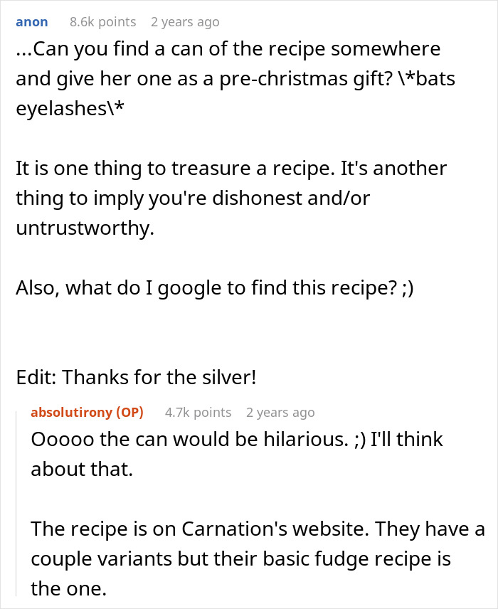 The Reddit user continued with their story by sharing that they came across an article about a chef who, after an extensive search, was able to trace the book from which their family recipe was taken. This is when OP remembered their secret family recipe and decided to do their own research to find out where the fudge recipe came from. This is when they found out that their special recipe was taken from an evaporated milk company and wasn’t a secret at all as it was on every can. This discovery made OP believe that someone from their family lied about the recipe’s real origin, and now they are thinking about whether they should share their revelation with others.