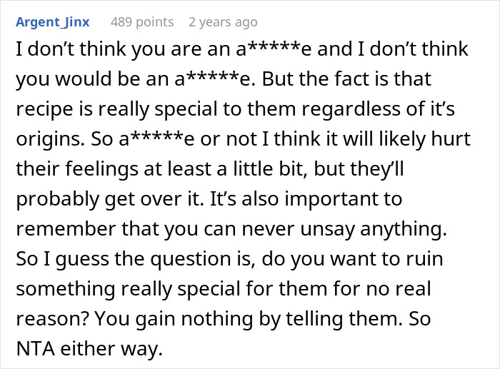 Some Reddit users shared that the truth about the recipe’s origins might spoil their relationship with the family