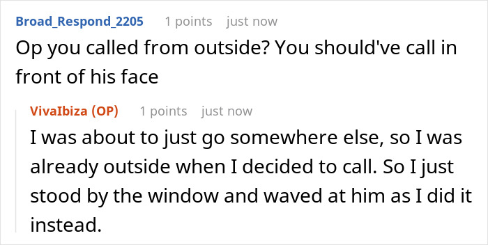 Oh, and there was that one dude who suggested OP should have called in from right in front of the person’s face. And then, when they tried to talk to them directly, they would shush them. “Sorry about that, this idiot keeps interrupting me.” Gotta love the internet.