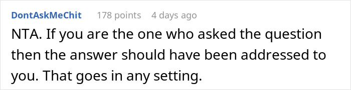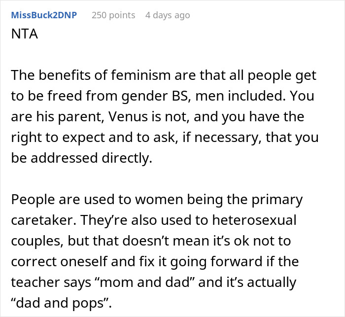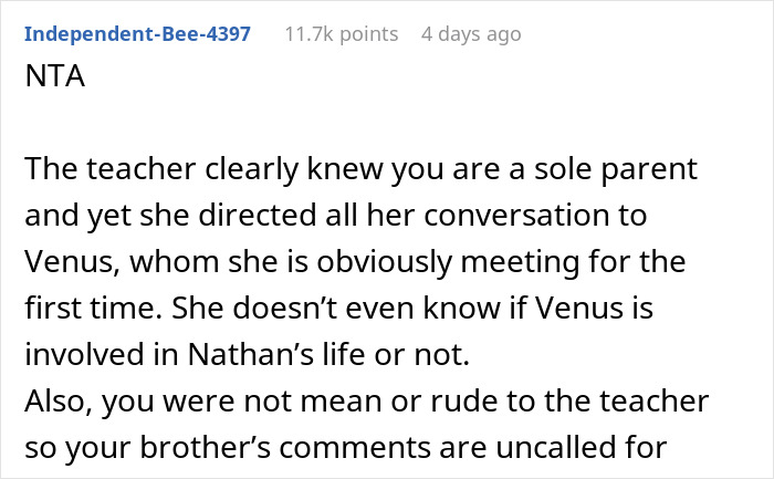 Yet most people in the comments sided with the Original Poster, although some of them are asking the same question as his brother-in-law. However, commenters also note that the teacher, firstly, knew very well that Mark is a sole parent and Venus is not, and secondly, the dad wasn’t mean or rude and was completely in his right, politely asking to address her remarks to him.