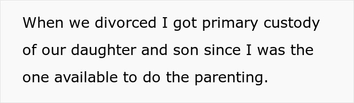 This redditor explained that after divorcing his ex-wife, he was the one who got full custody of the kids, as he was able to take care of them, while his wife had to work out of town most of the time.