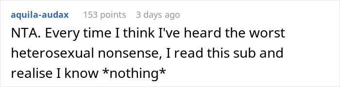 The post collected more than 27 thousand upvotes and almost 3 thousand comments in less than 4 days. The thread was soon locked by the moderators, as the discussion must’ve gotten too heated for the subreddit. The commenters decided that OP was not the jerk, with most commenting on the strangeness of the father’s views.