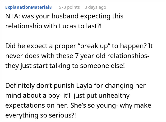 The Original Poster (OP) begins the story by saying that she has a 7-year-old daughter named Layla with her husband. Layla got her first boyfriend, named Lucas, several months ago. As they are 7, their relationship is limited to holding hands and giving cute gifts to each other such as drawings of hearts for Valentine’s Day.