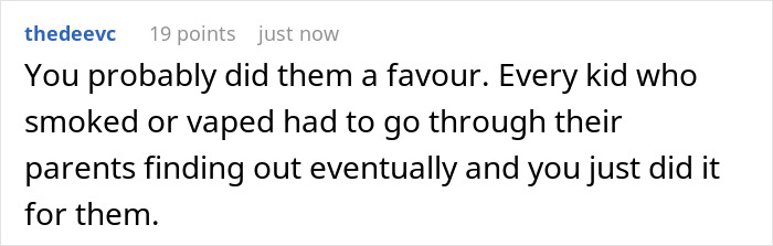 Many commenters supported the author’s means of retribution as they claimed that the whole vaping thing would also put things in perspective for his parents. Others advised the Redditor to call a tow truck if this happens again, as well as install some cameras to perhaps avoid further troubles.
