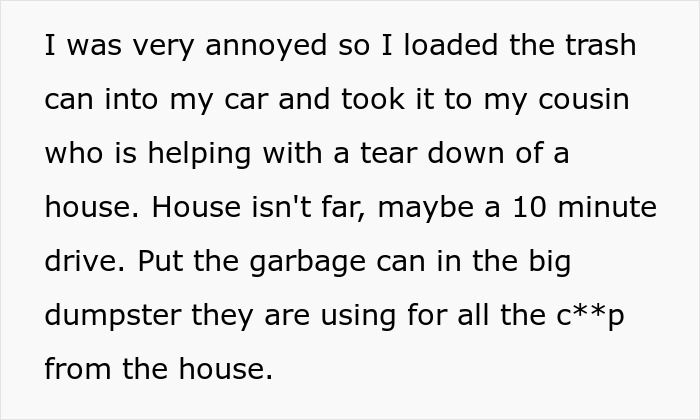 It all came to a head when OP wanted to drive somewhere but the bin was in front of her garage again. The poster snapped, loaded that trash can into her car, and just took it to a building site, dumping it into a construction waste container.