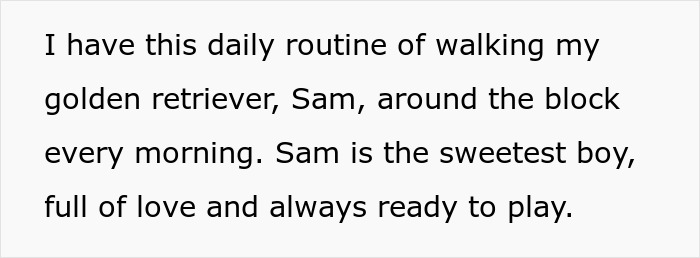 Well, the Original Poster (OP) and his best friend, a golden retriever named Sam, were doing their usual exercise around the block one fine morning. Anyone who has ever dealt with golden retrievers knows how sweet they are. Curious, funny, playful, and ready to forgive everything in the world for some belly rubs. Perhaps that is why the author of the post walked Sam unleashed (well the author does not point it out directly, however, he did not answer any of the questions regarding it in the comments. So, with a high degree of probability, it was this way).