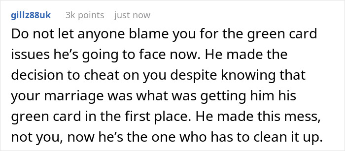 And the commenters also sincerely advised the original poster not to worry about her unsuccessful family life with this guy, because he actually chose this outcome for himself. “He made a decision to cheat on you despite knowing that your marriage was what was getting him his green card in the first place. He made this mess, not you, now he’s the one who has to clean it up,” someone in the comments wrote.