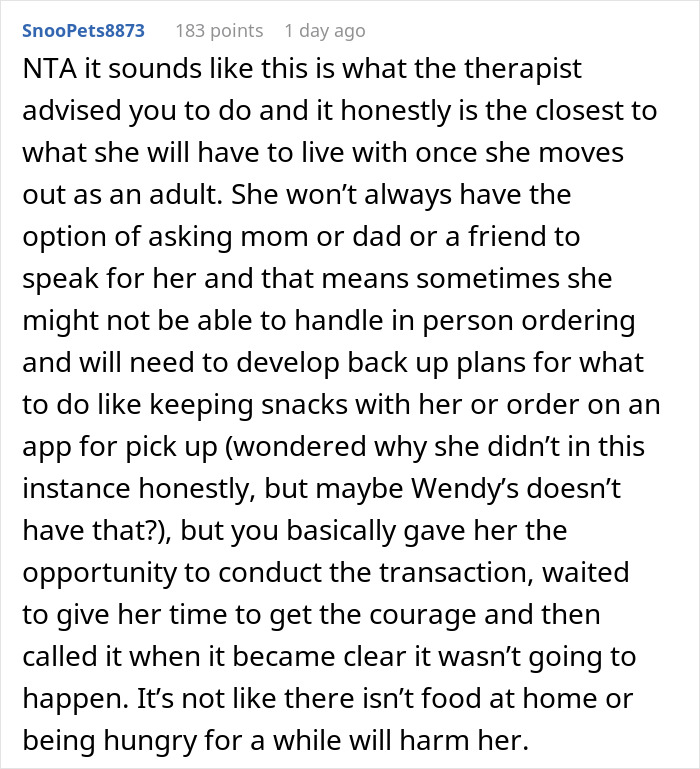 Others thought the OP was too harsh, potentially setting his daughter back instead of helping her. They argued a more supportive approach, like standing next to her while she ordered, could’ve eased her anxiety. One critic said, “A successful purchase means next time will be easier. An unsuccessful outing will set her back and make next time harder. So, congratulations! You made next time harder!”